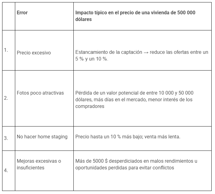 Una investigación de la Asociación Nacional de Agentes Inmobiliarios (NAR) muestra que las viviendas cuyo precio se fija correctamente desde el principio tienen más probabilidades de recibir múltiples ofertas y venderse a un precio cercano o superior al precio de venta. Por el contrario, un precio excesivo puede reducir el precio de venta final entre un 5 % y un 10 %. En una vivienda de 500 000 dólares, eso supone una pérdida potencial de entre 25 000 y 50 000 dólares.